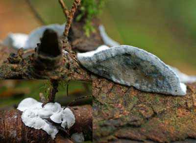 Postia caesia - Blauwe Kaaszwam, op stammen, takken en stronken van naaldbomen, het meest van spar, ook van den, larix,