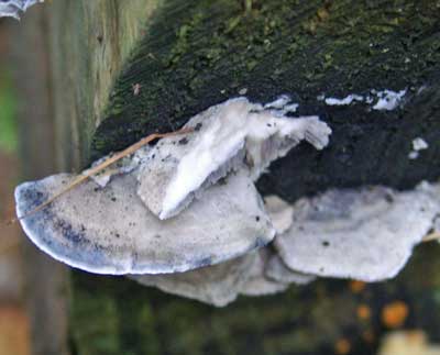 Postia caesia - Blauwe Kaaszwam, op stammen, takken en stronken van naaldbomen, het meest van spar, ook van den, larix, in kleine aantallen op douglasspar en taxus. Vindplaats: oktober 2007 buisjeszwammen