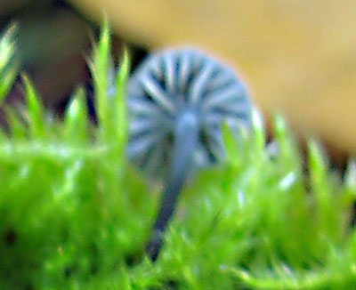 Blauwgrijze schorsmycena of Mycena pseudocorticola, op schors van levende loofbomen, vooral van wilg.