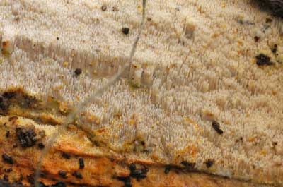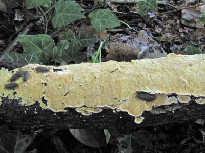 Bleke Stekelkorstzwam of Mycoacia aurea, op takken en stammen van loofbomen in loofbossen. Vindplaats: september 2010 korstzwammen