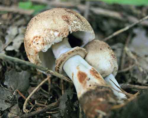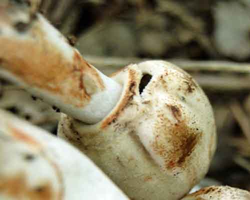 Bloedende champignonparasol of Leucoagaricus badhamii, op vrij kale voedselrijke kalkhoudende bodems, sterk vermolmd hout, op hellinkjes met weggespoelde humus,