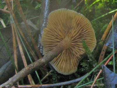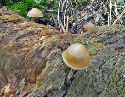 Dennenmosklokje of Galerina camerina, op dode stronken van naaldhout, meestal grove den in naald- en gemengde bossen.