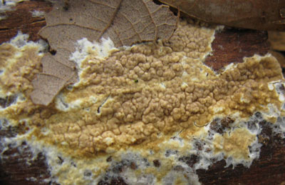 Dikke kelderzwam of Coniophora puteana. Saprotroof op loof- en naaldhout,ook op bewerkt hout in gebouwen. Op de derde foto is op de korst het plasmodium van een slijmzwam gekropen, de gele substantie. Vindplaats: Brummen, Hallsepad februari 2009 korstzwammen