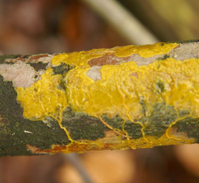 Op de derde foto is op de korst het plasmodium van een slijmzwam gekropen, de gele substantie.