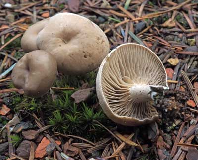 Dikke trechterzwam - Clitocybe alexandri, tussen bladeren op voedselrijke leem of kle. Vindplaats: Loenen Ereveld, november 2021 plaatjeszwammen
