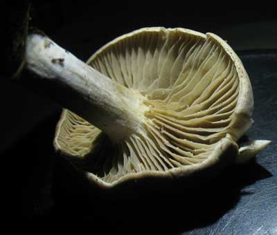 Dikke trechterzwam - Clitocybe alexandri, tussen bladeren op voedselrijke leem of kle.