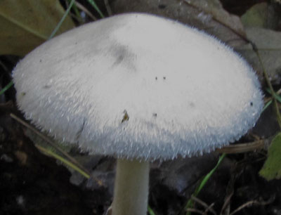 Donzige Beurszwam of Volvariella hypopithys, op humeuze grond in loofbossen en parken, soms in graslanden of open plaatsen in de duinen.