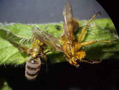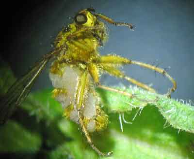 Entomophthora muscae, een schimmel die zich parasiteert op vliegen. In dit geval de strontvlieg - Scathophaga stercoraria.