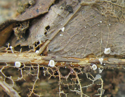 Esdoornfranjekelkje of Lachnum rhytismatis, op bladeren van esdoorn. vindplaats: september 2008 ascomyceten