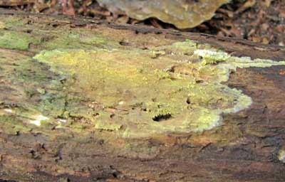 Gele Stekelkorstzwam of Mycoacia uda, op diverse soorten loofhout, het meest op beuk, eik en els. Vindplaats: september 2007 vlieszwammen