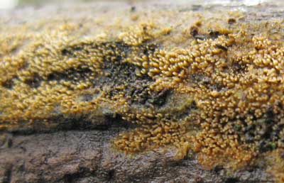 Gele Stekelkorstzwam of Mycoacia uda, op diverse soorten loofhout, het meest op beuk, eik en els.