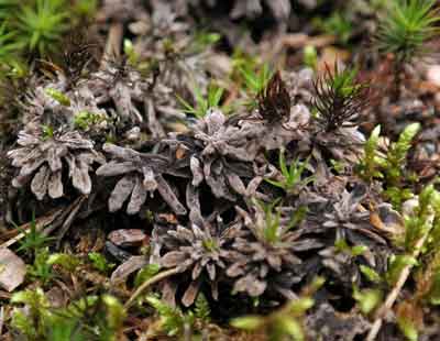 Gesploos rouwkorstje of Tomentella fuscocinerea, op dood hout
