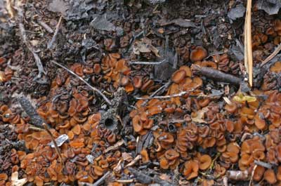 Gewoon houtskoolbekertje of Anthracobia melaloma. Deze soort komt alleen voor op brandplekken. Ze verschijnen soms als hele plakken.