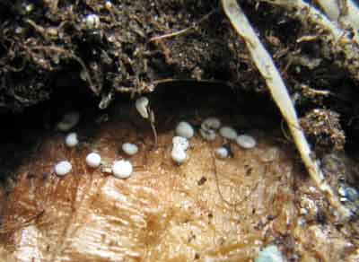 Glad kristalkopje of Didymium difforme. Deze soort zat ook bij de wortels van de hyacint. Ook gevonden op takje