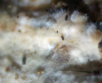 Gladsporig Dwergkorstje of Trechispora cohaerens, op loof- en naaldhout, zowel liggend op de grond als hoog in de kroon.