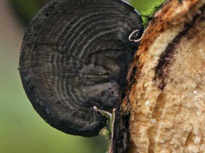 Glanzende Houtskoolzwam of Daldinia vernicosa, saprotroof op verbrand hout van brem, berk of eik.