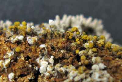 Goudgeel Lantaarntje of Cribraria aurantiaca. Deze soort komt voor op naaldhout. Vindplaats: Groot en Klein Starink augustus 2011 slijmzwammen