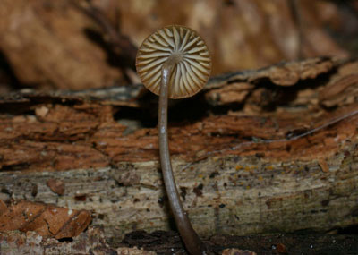 Goudrandmycena of Mycena aurantiomarginata, op strooisel van naaldbomen en struiken. vindplaats: augustus 2011 plaatjeszwammen