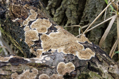 Harige Kelderzwam of Coniophora olivacea, gewoonlijk op naaldhout. Vindplaats: Brummen, Engelenburg februari 2013 korstzwammen