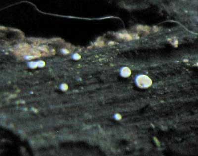 Kernzwamknopje of Polydesmia pruinosa, loofhouttakken en twijgen op oude paddestoelen. vindplaats: januari 2009 ascomyceten