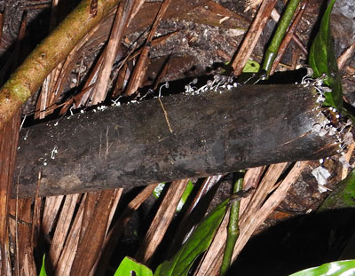 Kleinsporige halminktzwam of Coprinus phaeosporus, op kruidachtige plantendelen bij vuilnisbelt, ruigtevegetatie.