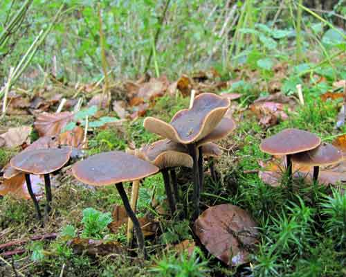 Levertraanzwam of Macrocystidia cucumis, in strooisel van loofbossen.