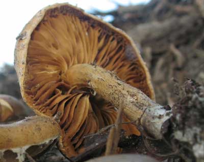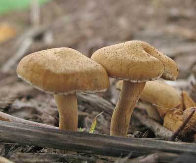 Okeren leemhoed of Agrocybe ochracea, op houtsnippers. Deze vondst was op houtsnippers van een Meidoornhaag.