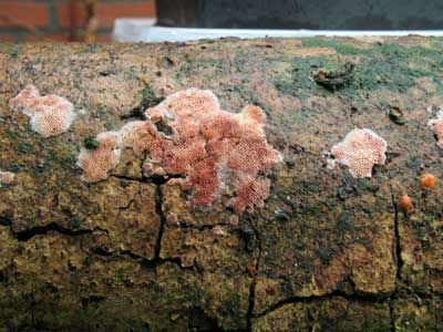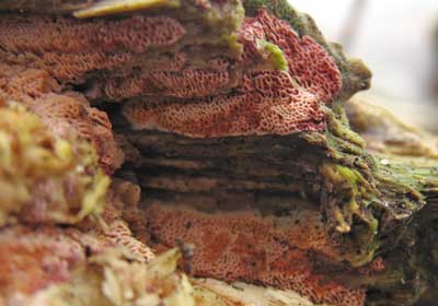 Paarse Wasporia of Ceriporia purpurea op sterk vermolmde takken en stammen van els of es in loofbossen.