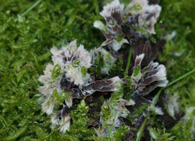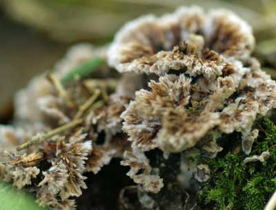 Penseelfranjezwam of Thelephora penicillata, mycorrhizavormend met loof- en naaldbomen, vruchtlichamen op strooisel en twijgen.