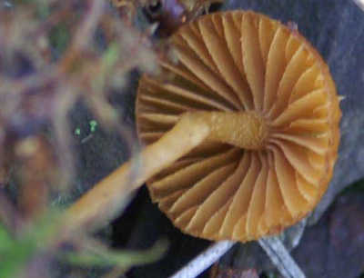 Puntig mosklokje of Galerina triscopa, op rottend hout in loofbossen op zand- en kleibodems. Vindplaats: oktober 2009 plaatjeszwammen