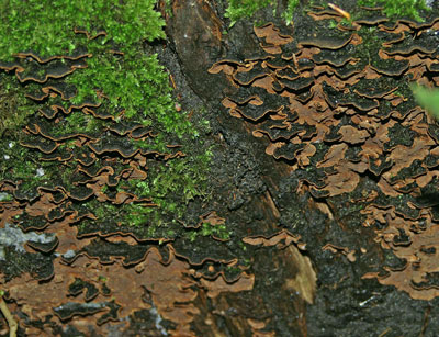 Roestkleurige Borstelzwam of Hymenochaete rubiginosa,op loofhout, vooral op eik, voornamelijk in loofbossen. Vindplaats: Apeldoorn, Woudhuis juni 2008 korstzwammen