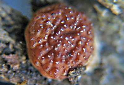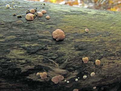 Rossige Kussentjeszwam of Hypocrea rufa, op rottend hout van loofbomen, soms op naaldhout of op oude Polyporaceae (houtzwammen).