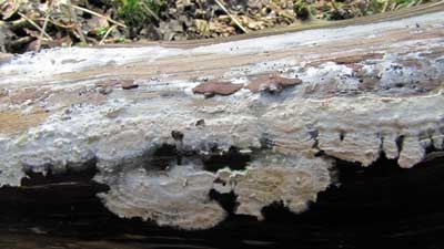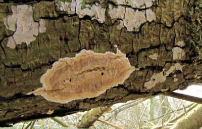 Roze Populierenschorszwam of Peniophora polygonia, op vaak nog hangende, dode takken en twijgen van populier, in het bijzonder ratelpopulier.