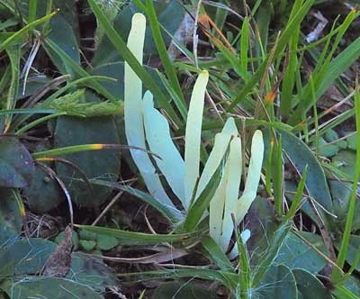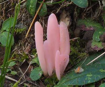 Rozerode knotszwam - Clavaria rosea tussen gras en mossen.