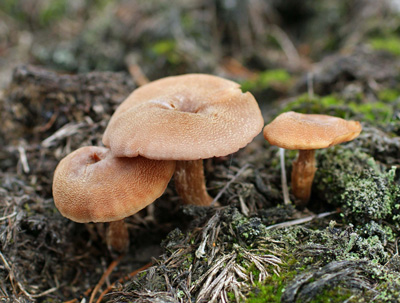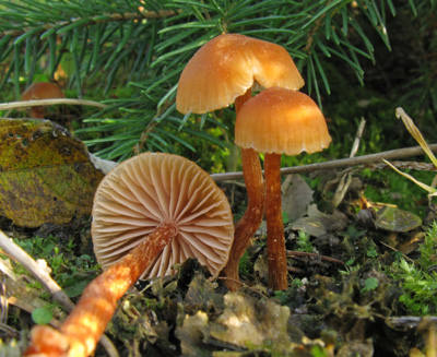 Schubbige Fopzwam of Laccaria proxima, ectomycorrhiza vormend met loof- en naaldbomen, vooral met berk, eik en den.