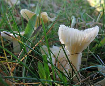 Smoezelig sneeuwzwammetje of Hygrocybe virginea var. ochraceopallida, op de grond in gras- en hooilanden. vindplaats: Park de Hoge Veluwe, november 2014 plaatjeszwammen