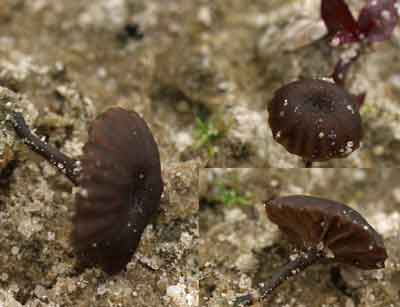 Somber trechtertje of Omphalina obscurata, tussen mos in voedselarm tot matig voedselrijk droog zand. vindplaats: Apeldoorn, Zuidwijken mei 2009 plaatjeszwammen
