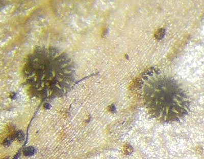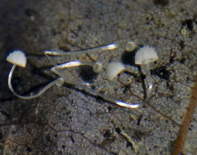 Stekeltjesmycena of Mycena tenuispinosa, op levende stammen van loofbomen.
