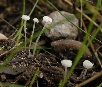 Stengelmycena of Hemimycena pseudocrispula, op strooisel in naaldbos op droge rijke zandgrond,