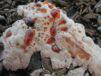 De 2 laatste foto's laten de zwam in de imperfecte vorm zien, de rode druppels zijn gutatiedruppels.