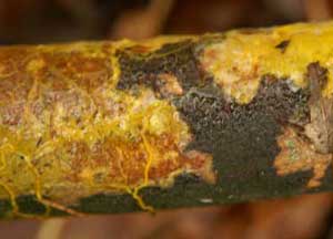 De slijmzwam is bij de gele kleur nog niet rijp, wat bij de blauwe kleur wel het geval is.