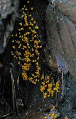 Troskalknetje of Badhamia utricularis. Voor het Troskalknetje gevormd is verspreidt zich eerst het plasmodium. Uit dit plasmodium vormen zich de slijmzwammen.
