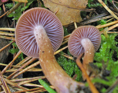 Tweekleurige Fopzwam of Laccaria bicolor, ectomycorrhiza vormend met naald- en loofbomen zoals den en beuk, in naald- en gemengde bossen.