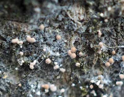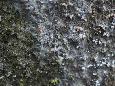 Tweesporig vliesje - Athelia arachnoidea, op de schors van een beuk. In het grijze waas zijn de Bulbillen (wit en roze bolletjes) herkenbaar.