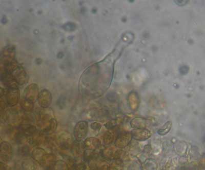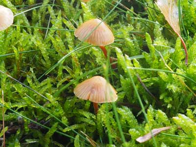 Vaal mosklokje - Galerina mniophila, op levend baldmos in naaldbos.