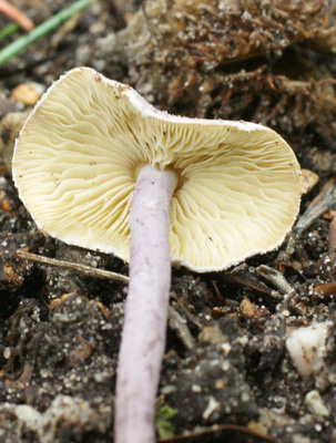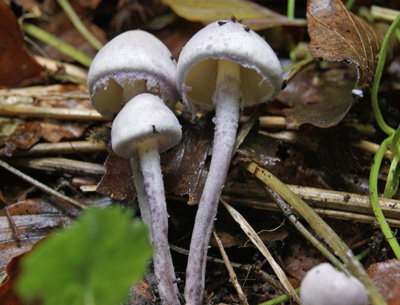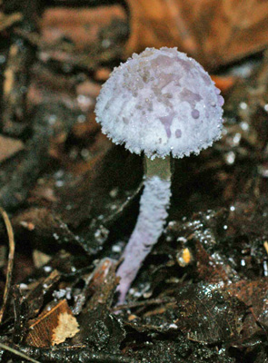 Violetstelige Poederparasol of Cystolepiota bucknallii. Saprotroof op sterk met humus vermengde, soms iets modderige, rijke grond, vooral in hellingbossen op krijt, ook in bossen op rivierklei en oude steenstort van kolenmijn.