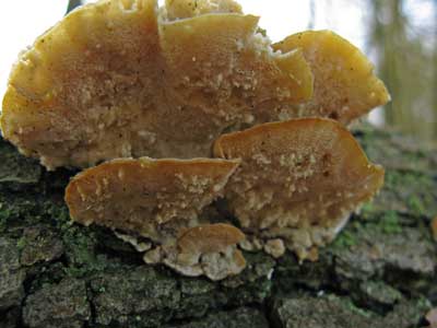 Waaierkorstzwam of Stereum subtomentosum, op loofhout, veelal els en wilg.