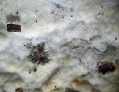 Wit franjevlies of Piloderma byssinum, op dood hout van naaldbomen en -struiken in naaldbos op zandgrond.