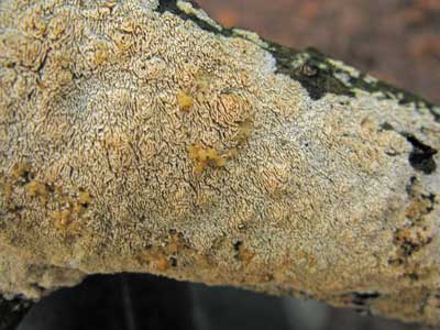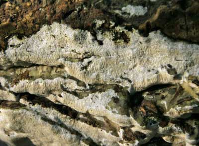 Witte Tandzwam of Schizopora paradoxa, op takken, stammen en stronken van eik, berk, els en beuk.