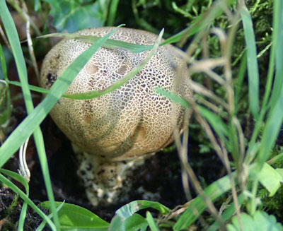 Wortelende aardappelbovist of Scleroderma verrucosum, op kleigrond bij loofbomen en struiken.